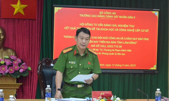 Ngày 12/9/2025, Trường Cao đẳng CSND II đã tiến hành nghiệm thu đề tài KH&CN cấp Cơ sở: “Nâng cao năng lực cho đội ngũ Công an xã chính quy đáp ứng yêu cầu hiện nay trên địa bàn tỉnh Lâm Đồng”, mã số CSLL.2023.T10.38 do đồng chí Thượng tá, TS. Phạm Minh Hiếu - Phó Trưởng phòng Quản lý học viên làm chủ nhiệm.