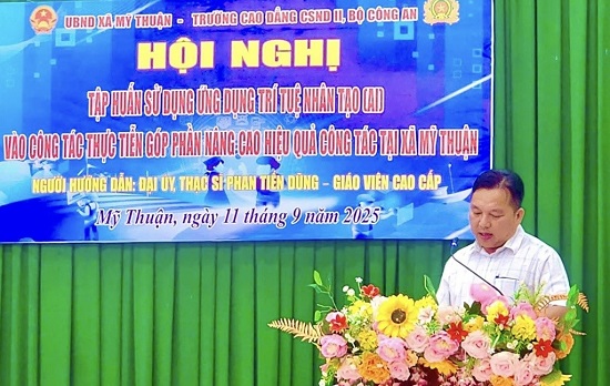 Ngày 11/9/2025, Khoa Ngoại ngữ - Tin học, Trường Cao đẳng Cảnh sát nhân dân II phối hợp với Công an xã Mỹ Thuận, tỉnh Vĩnh Long tổ chức Hội nghị tập huấn sử dụng ứng dụng trí tuệ nhân tạo (AI) vào công tác thực tiễn cho cán bộ, công chức, viên chức, nhân viên đang công tác tại các ban, ngành, đoàn thể, trường học trên địa bàn xã.
