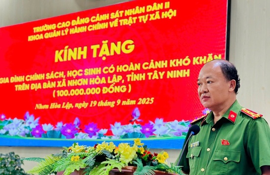 Phát biểu tại buổi gặp mặt và trao quà, đồng chí Đại tá, TS Huỳnh Văn Em - Phó Hiệu trưởng chia sẻ: “Những phần quà tuy không lớn về vật chất nhưng chứa đựng tình cảm, trách nhiệm của cán bộ, giáo viên, học viên Trường Cao đẳng Cảnh sát nhân dân II. Chúng tôi mong muốn đây sẽ là động lực để các gia đình chính sách và học sinh nghèo có hoàn cảnh khó khăn vươn lên trong cuộc sống”.