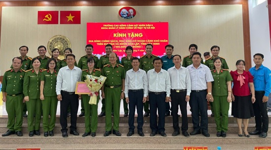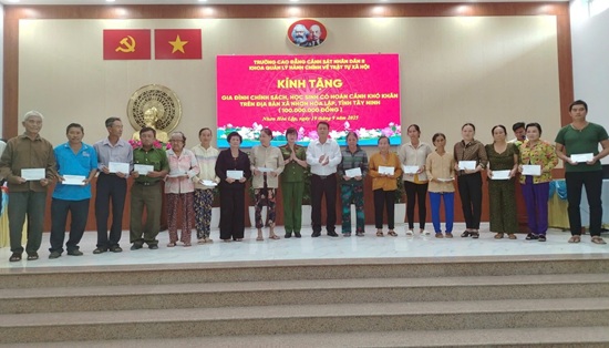 Bên cạnh đó, Đoàn về nguồn của Nhà trường đã phối hợp với Ủy ban nhân dân xã Nhơn Hòa Lập, tỉnh Tây Ninh tổ chức trao quà cho thân nhân Bà mẹ Việt Nam Anh hùng, gia đình chính sách và học sinh nghèo có hoàn cảnh khó khăn trên địa bàn. Trong đó, Khoa Quản lý hành chính về trật tự xã hội cùng học viên các lớp chuyên ngành Cảnh sát Quản lý hành chính về trật tự xã hội Khóa K30S, K31S đã trao tặng 112 phần quà tiền mặt với tổng trị giá 100 triệu đồng.