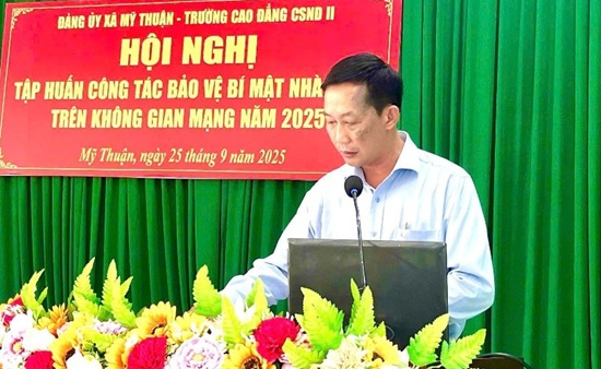 Ngày 25/9/2025, Khoa Ngoại ngữ - Tin học, Trường Cao đẳng Cảnh sát nhân dân II phối hợp với Công an xã Mỹ Thuận, tỉnh Vĩnh Long tổ chức Hội nghị tập huấn công tác bảo vệ bí mật nhà nước trên không gian mạng tại xã Mỹ Thuận. Đây là hoạt động thiết thực nằm trong chuỗi các hoạt động trọng tâm trong thời gian công tác thực tế tại Công an xã Mỹ Thuận của giáo viên Khoa Ngoại ngữ - Tin học nhằm triển khai thực hiện hiệu quả Luật Bảo vệ bí mật nhà nước năm 2018, Chỉ thị số 14/CT-TTg ngày 25/5/2018 của Thủ tướng Chính phủ về nâng cao năng lực phòng chống phần mềm độc hại, Chỉ thị số 02/CT-TTg ngày 04/7/2018 của Thủ tướng Chính phủ về công tác bảo vệ bí mật nhà nước trên không gian mạng, Nghị định số 13/2023/NĐ-CP ngày 17/4/2023 của Chính phủ về bảo vệ dữ liệu cá nhân...