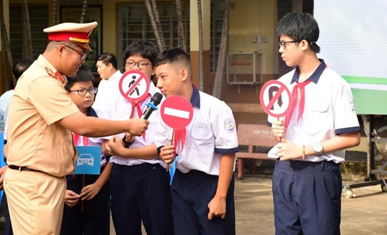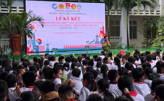 Khoa Cảnh sát giao thông đã phối hợp tổ chức các buổi tuyên truyền tại Trường THCS Hoa Lư (ngày 15/9/2025) và THCS Đống Đa (ngày 29/9/2025) với tổng số 3.900 cán bộ, giáo viên và học sinh tham gia. Nội dung tuyên truyền tập trung vào các quy tắc tham gia giao thông an toàn như: đội mũ bảo hiểm đúng quy cách, chấp hành tín hiệu đèn giao thông, đi đúng làn đường; hướng dẫn nhận biết ý nghĩa các biển báo hiệu giao thông đường bộ thường gặp; hậu quả của việc vi phạm pháp luật giao thông và trách nhiệm của mỗi học sinh trong việc tham gia giao thông an toàn.