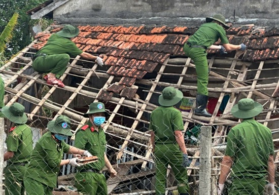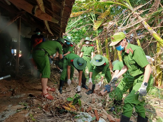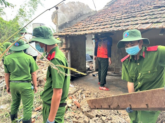 Cán bộ, giáo viên, học viên Trường Cao đẳng CSND 2 giúp dân thu dọn vật liệu đổ nát sau lũ lụt.