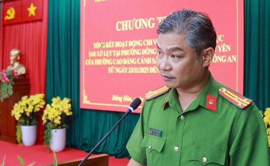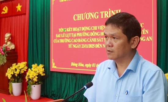 Phát biểu tại buổi lễ, đồng chí Huỳnh Mỹ Phong - Chủ tịch UBND phường Đông Hoà, đại diện cho địa phương đã bày tỏ lòng cảm kích sâu sắc trước những đóng góp không quản ngại gian khó của tập thể Trường Cao đẳng CSND II. Đồng chí Chủ tịch UBND phường nhấn mạnh sự hiện diện và hỗ trợ kịp thời này là nguồn động viên tinh thần vô giá, giúp địa phương vượt qua giai đoạn khó khăn nhất.